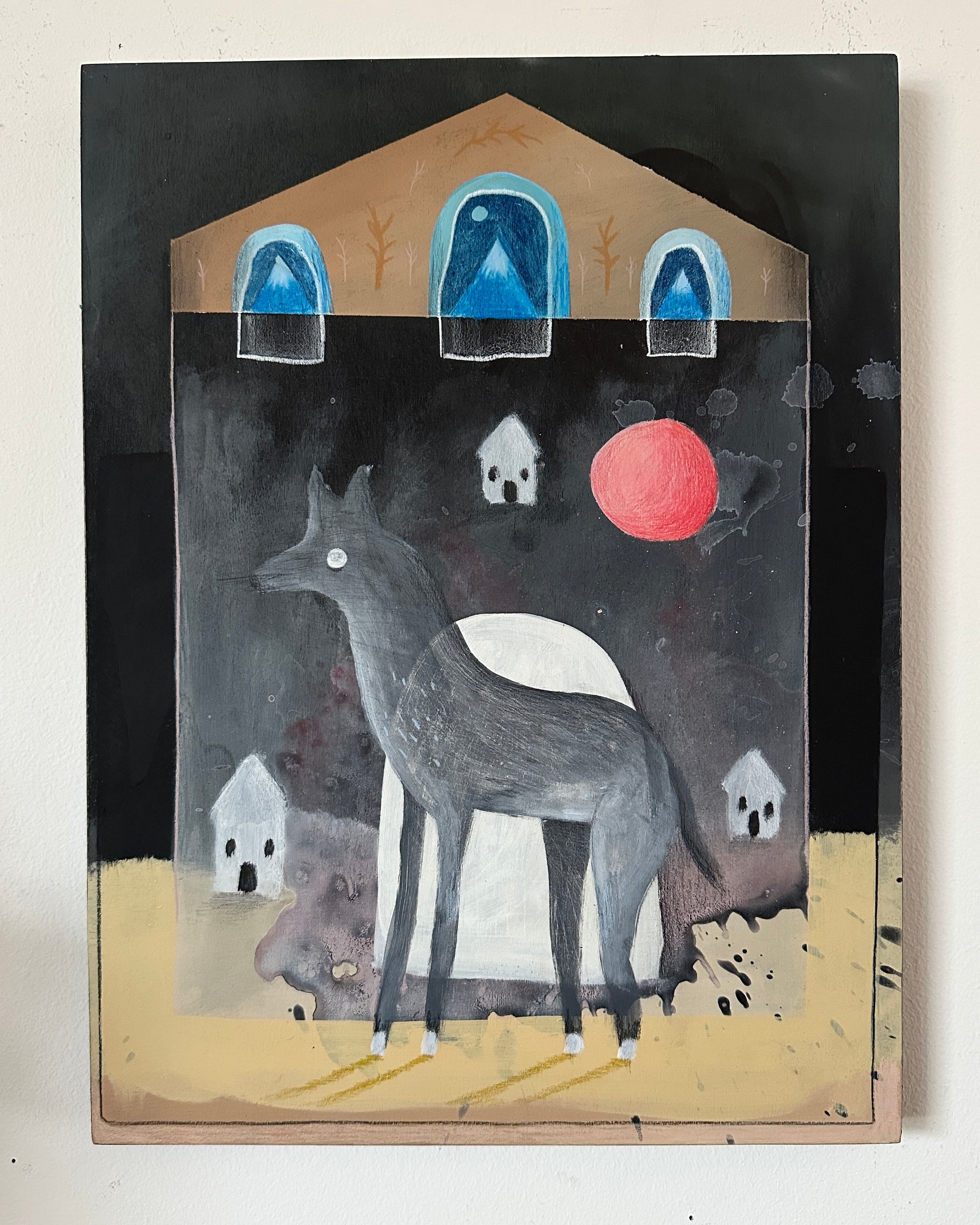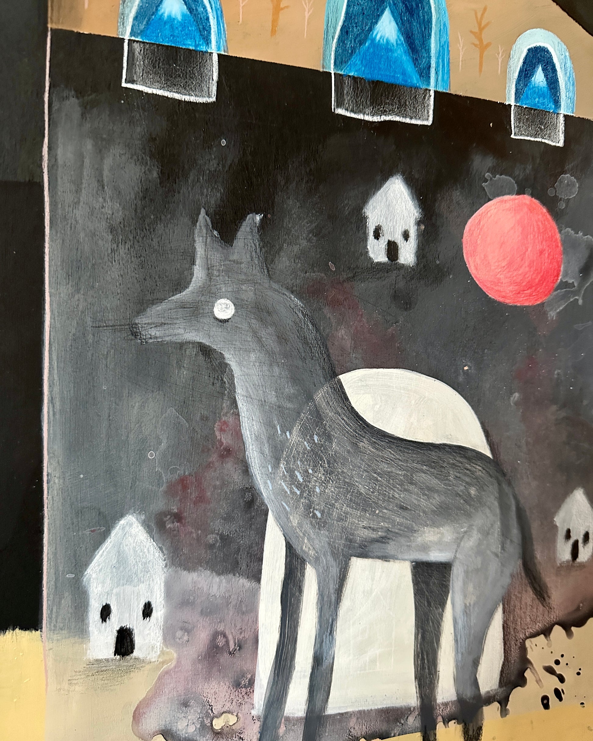 Acrylic, oil pastel, wax pastel, pencil.