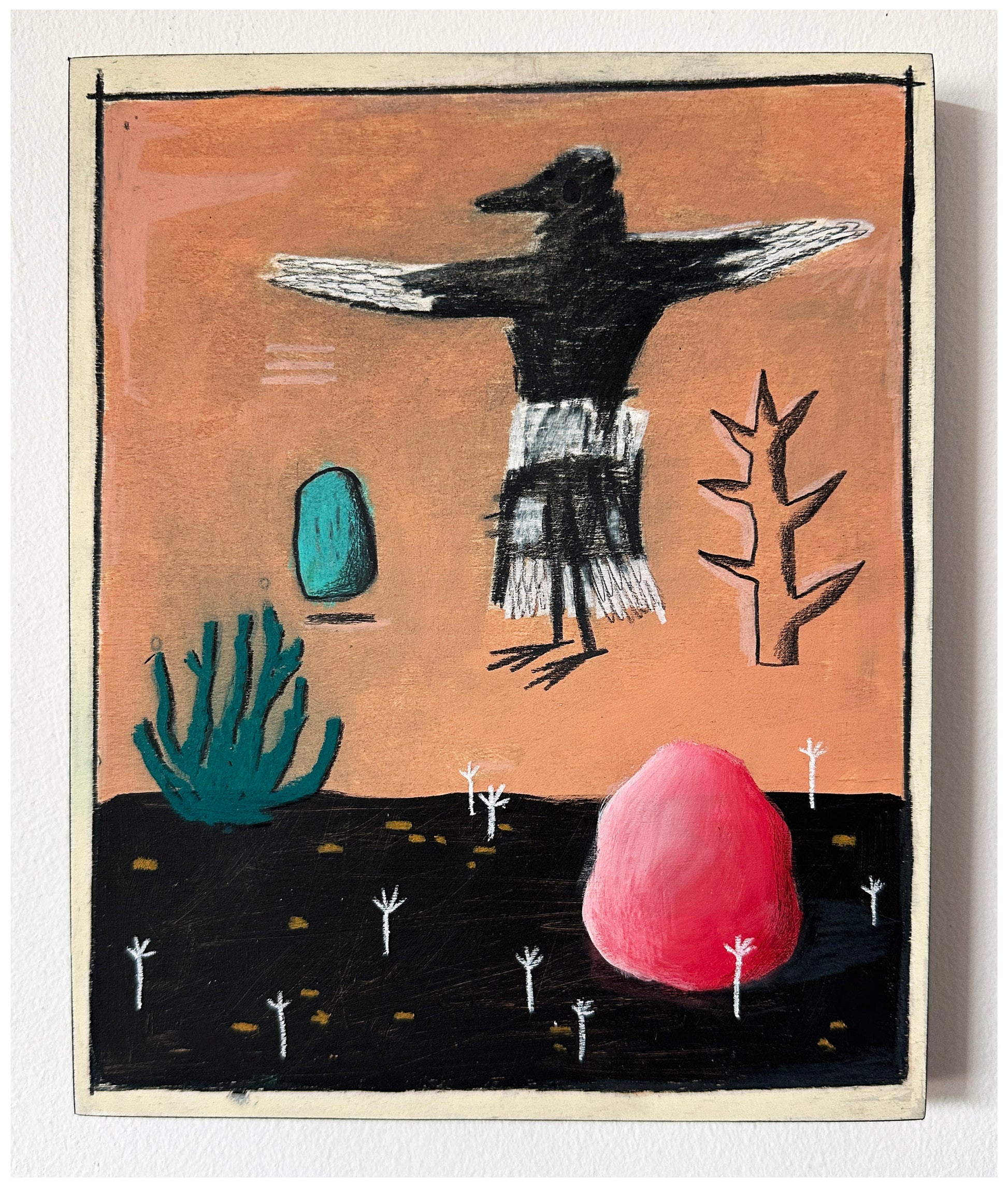 Acrylic, pencil, oil pastel, wax pastel.