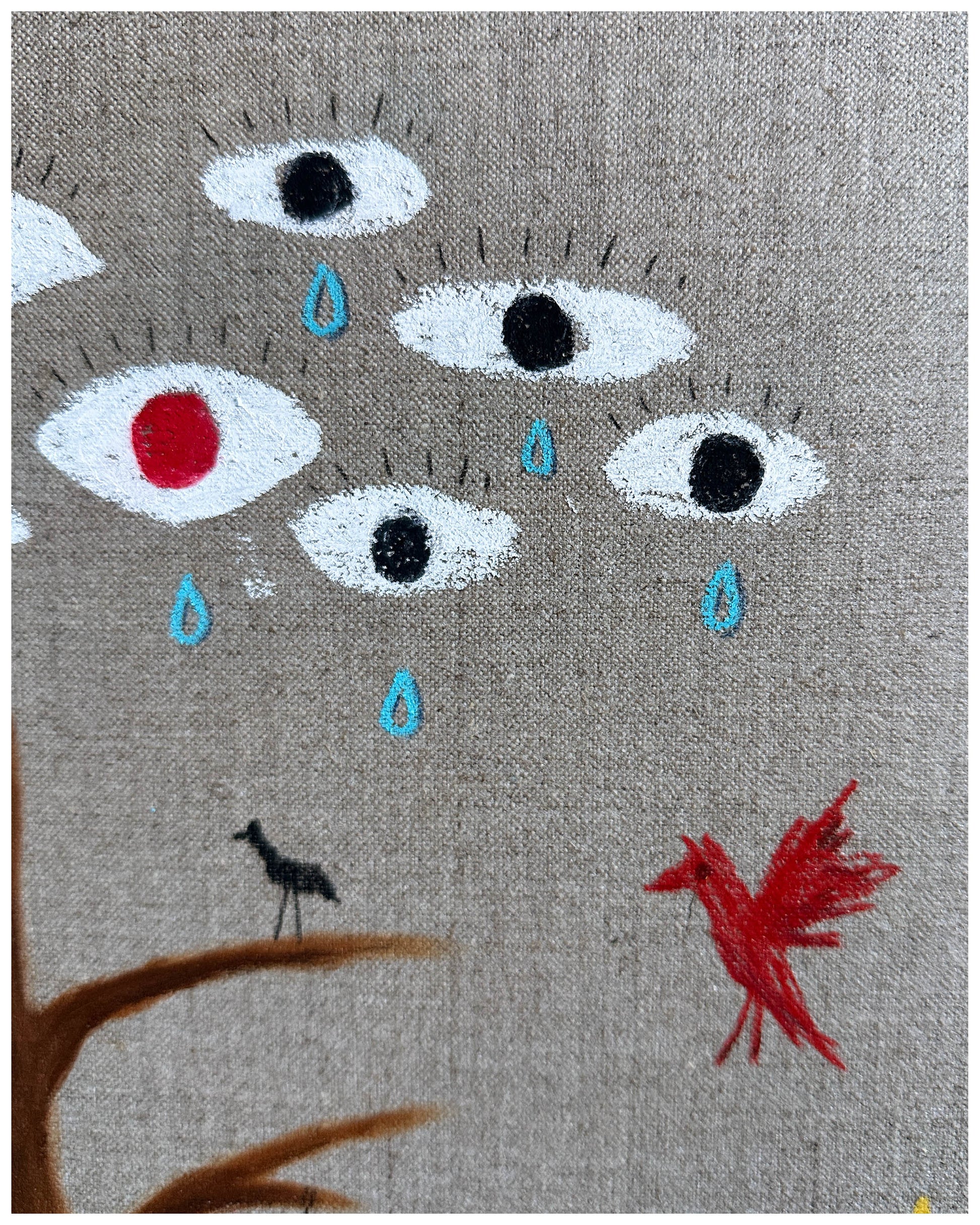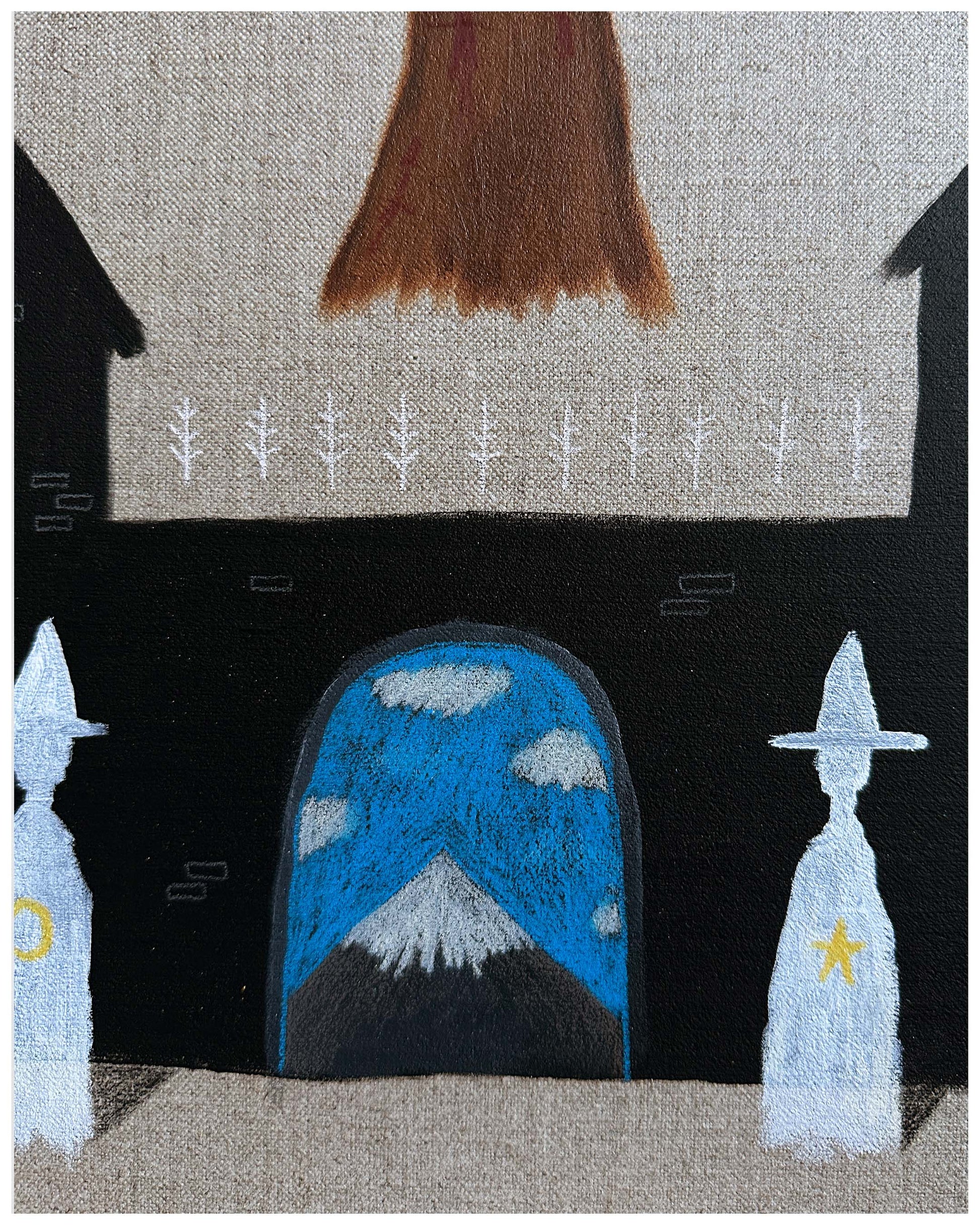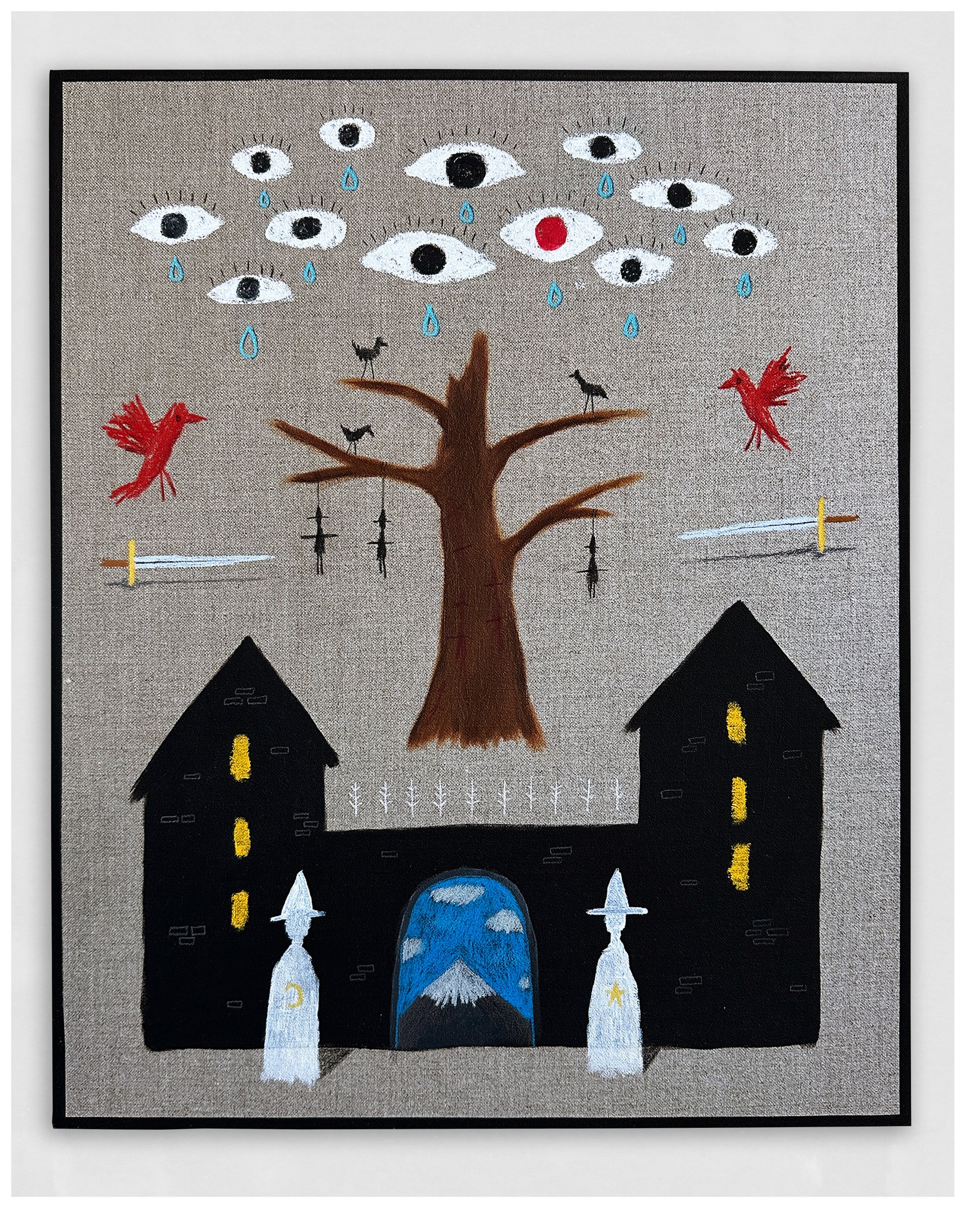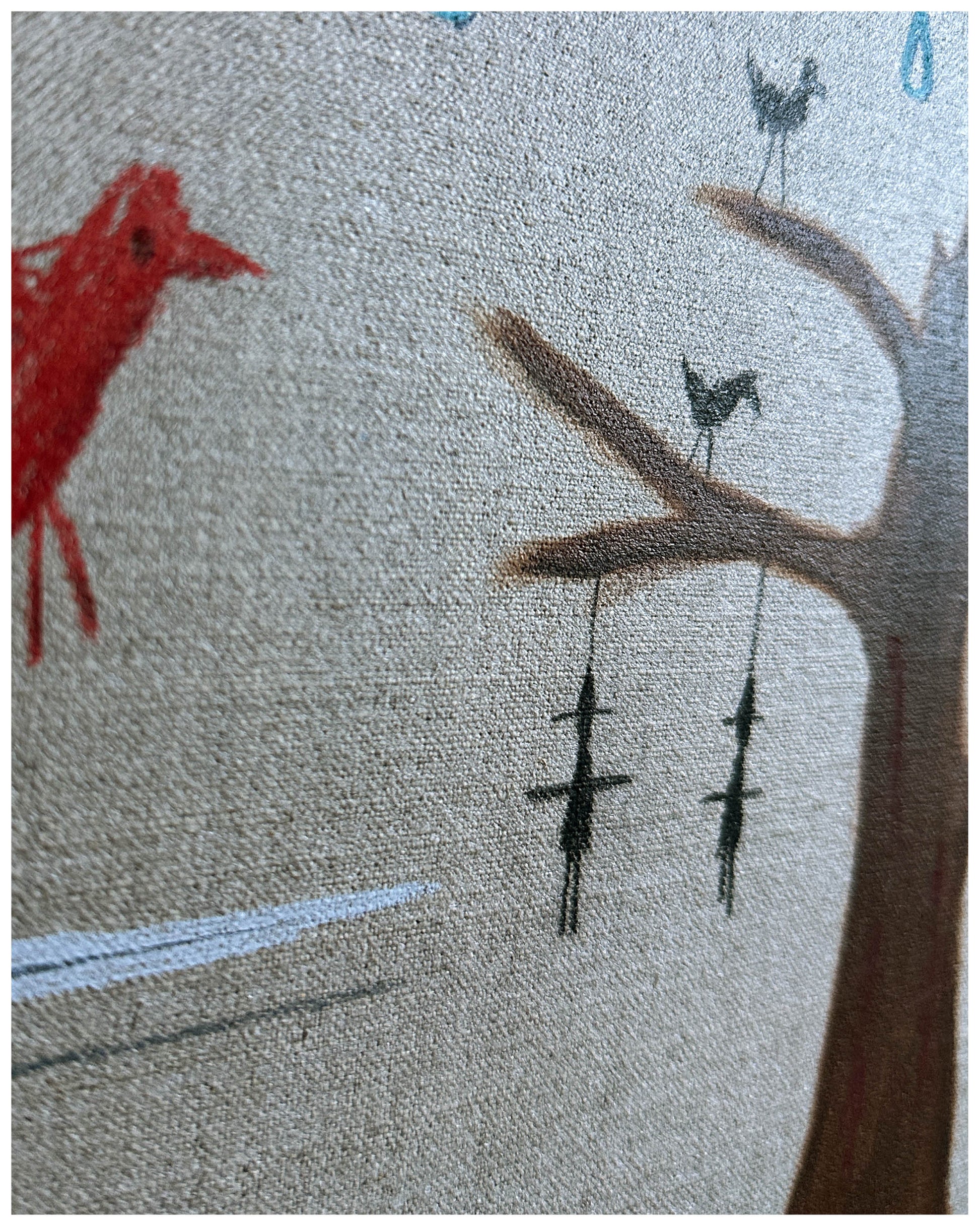 Acrylic, wax pastel, oil pastel, pencil.