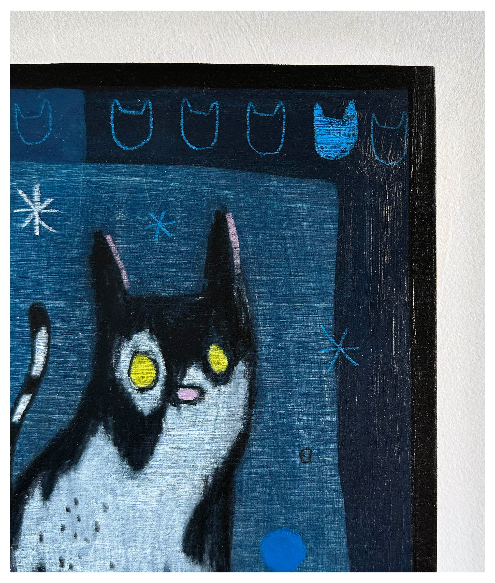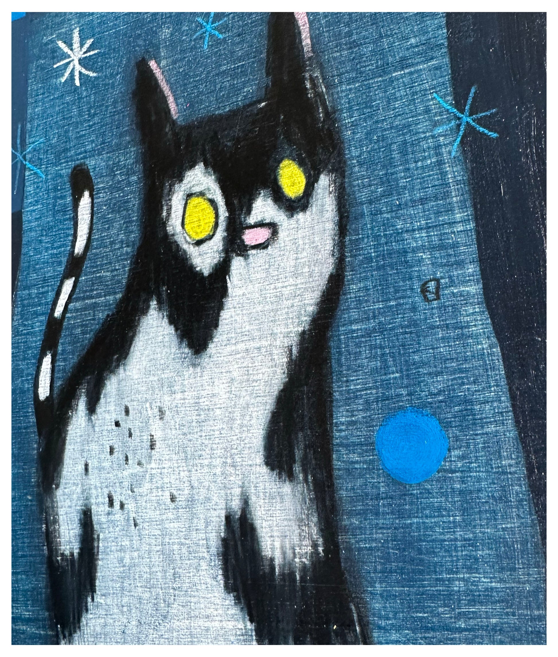 Acrylic, pencil, wax pastel.