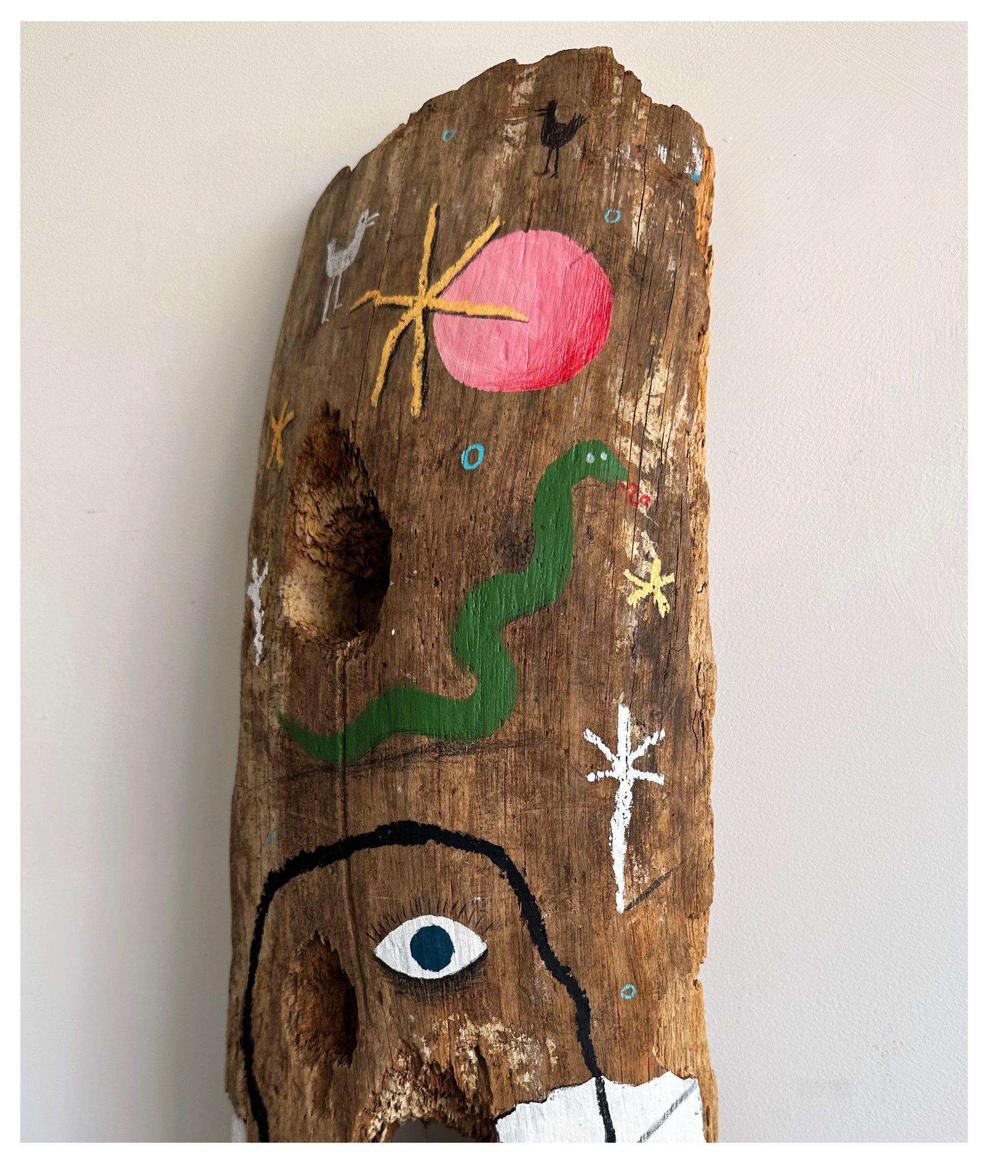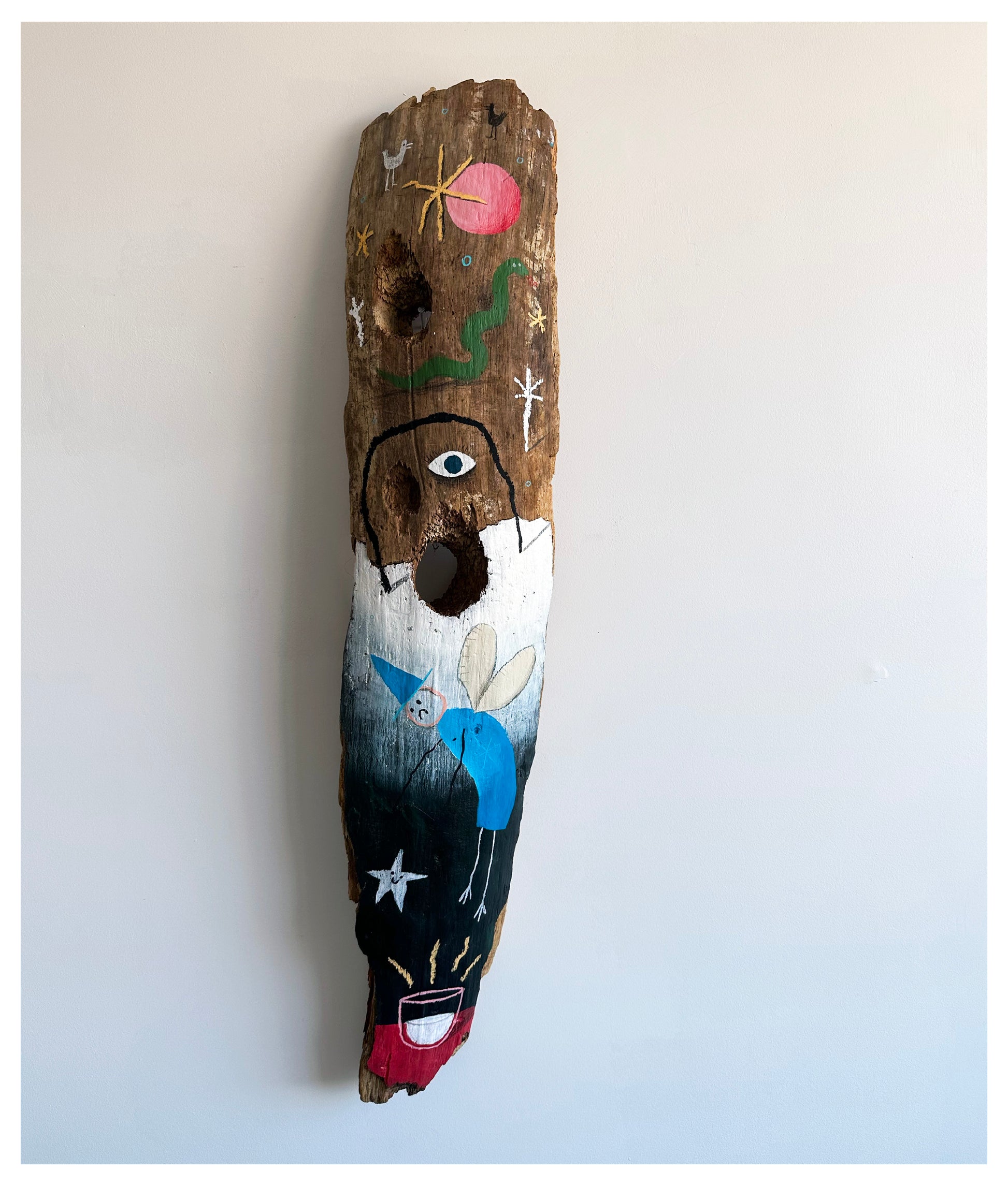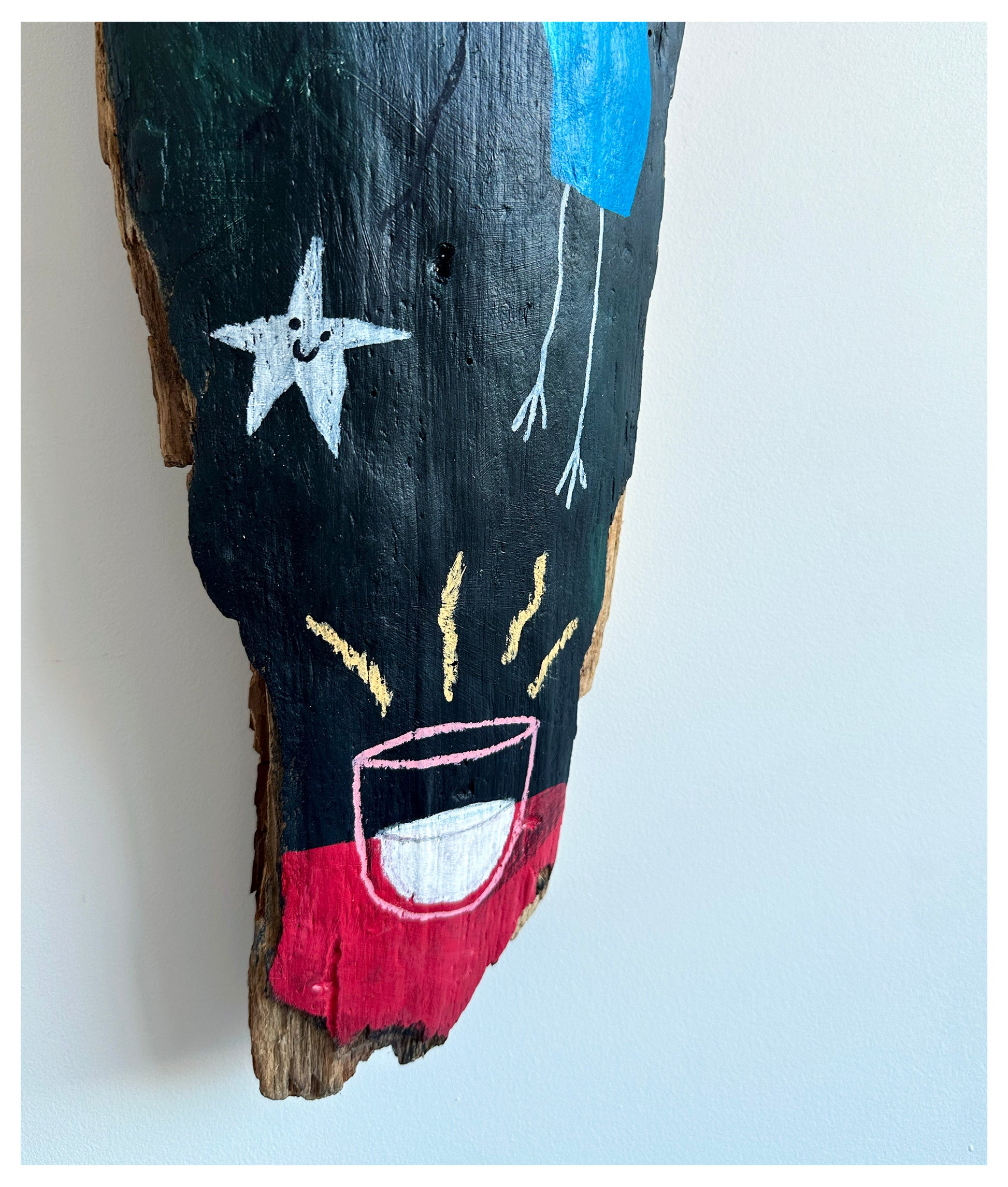 Acrylic, oil pastel, pencil, wax pastel.