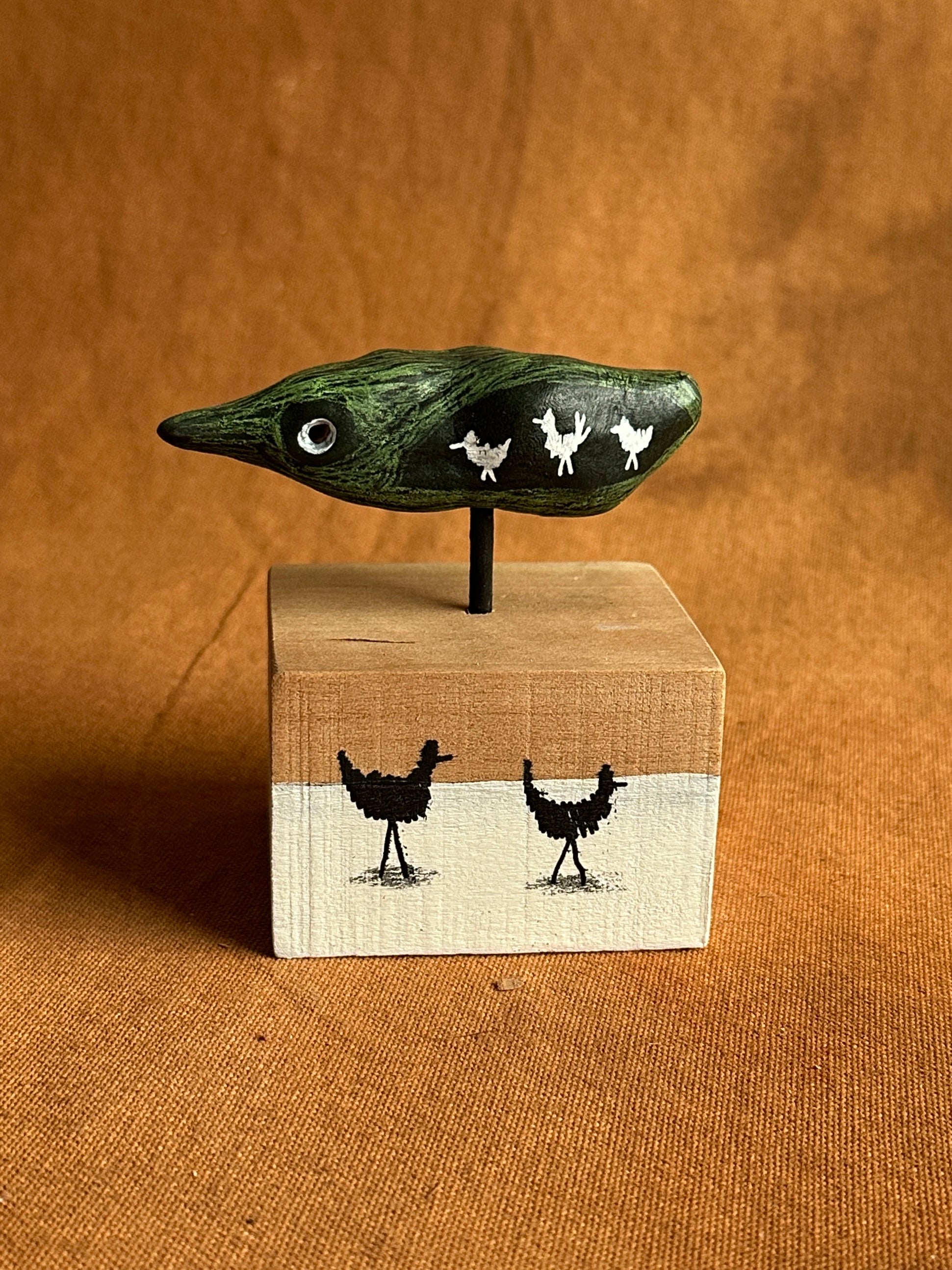 Acrylic, pencil, posca on air dry clay on wooden base.